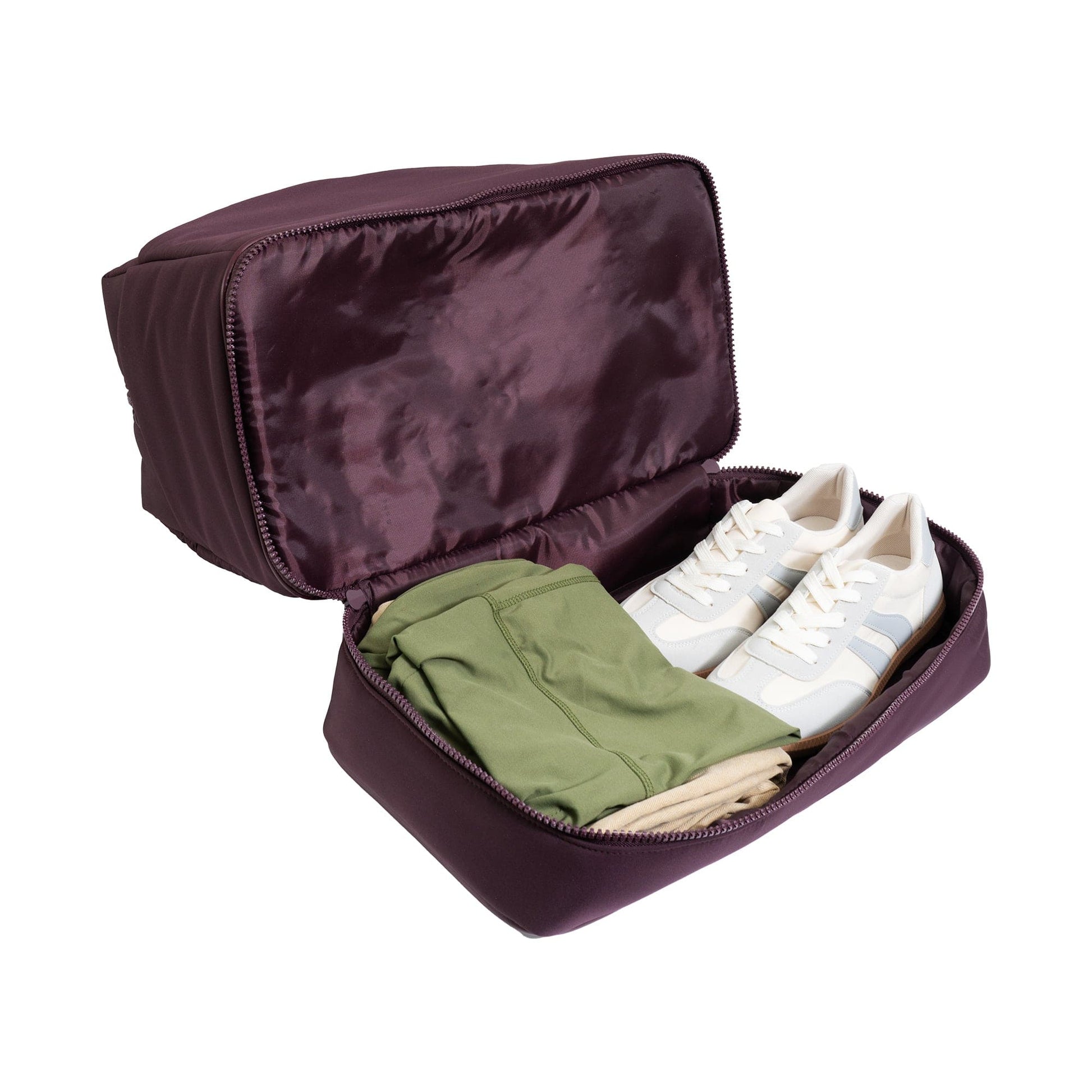 A separate bottom zip compartment offers convenient storage for shoes, laundry, or larger accessories—keeping clean and used items neatly divided. -
